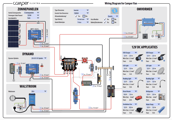 Je kunt het schema aanpassen op jouw behoeften. Zo kun je tot 5 zonnepanelen selecteren, geschakeld in serie of parallel, het bestand berekend vervolgens de juiste MPPT laadregelaar. Bepaal zelf de grootte van de: DC-DC lader, acculader en omvormer. Ook kun je kiezen voor een accumonitor en/of afstandsbediening voor je omvormer.